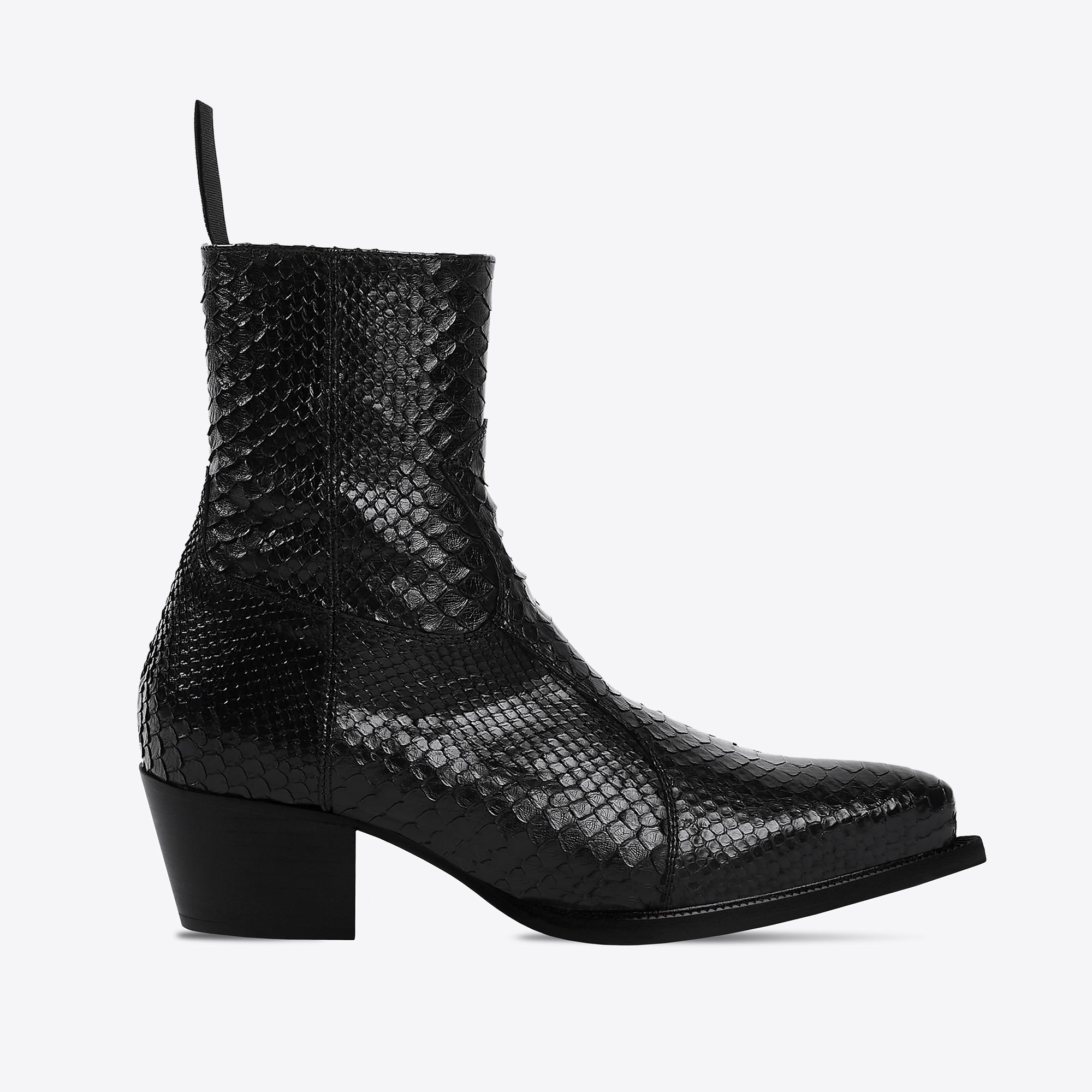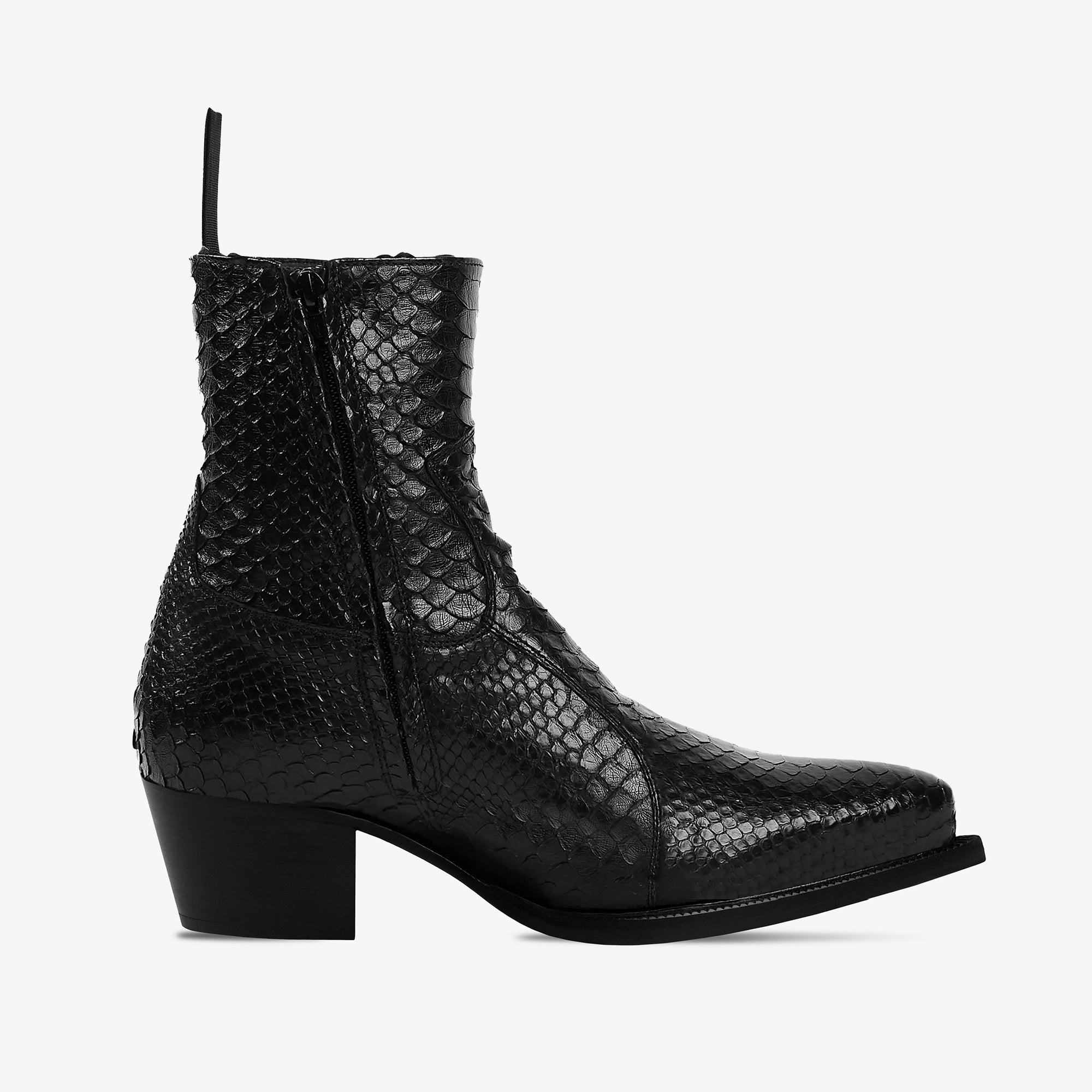 Dante: our 65mm cuban heeled ankle-high western side zip panel boot, is a refined take on the classic cowboy boot. Now exquisitely crafted with the finest genuine python skin, along with the usual custom hand made sole. An enclosed YKK zipper adds to the sleek look of this boot. All of our boots are handmade using Blake stitch construction, which allows for a close-cut sole giving the boot a sleek profile. It's also a process that allows for resoling once the outsole is worn, meaning these boots can last a lifetime.